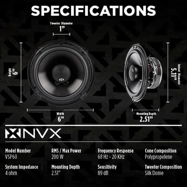 : With a top-mount depth of 2.51" and cutout dimensions of 5.11", these speakers are easy to install in cars, trucks, or doors, offering a seamless fit and hassle-free setup.: With an impedance of 4 ohms and a frequency response ranging from 68Hz to 20kHz, these speakers are compatible with a wide range of car audio systems, delivering consistent and immersive sound across various music genres.