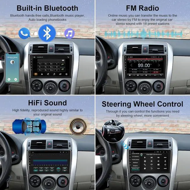 Bluetooth & FM Radio & HIFI for 2012 Toyota Corolla bluetooth car stereo support hands-free calling, Phonebook calling records download, audio stream music, with high-quality stereo, which can search channels in full-automatic ways, semiautomatic way and accurate adjustment way. With 18 preset stations, you can save all favorite stations and listen to news, music and program anytime. With Hi-fi high - fidelity sound, original sound immersive sound.