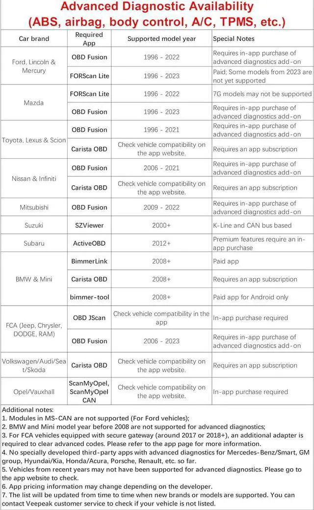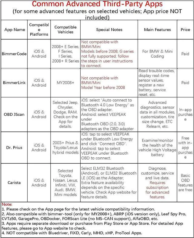 Note: currently there is no Veepeak App coming with this device; third-party Apps are required but not included and requires separate download or purchase from Play Store or App Store (depending on your vehicle and needs; check images for all compatible Apps); NOT compatible with pre-2008 models or G series when used with BimmerCode; Not suitable for pre-2008 models for BimmerLink; NOT compatible with Bluedriver, FIXD, Carly, MHD, xHP, ProTool and other Apps that are not listed.