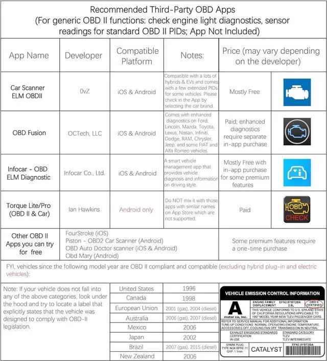VEHICLE COMPATIBILITY Compatible with model year 1996+ cars and light trucks in the US and 1998+ in Canada for basic OBD II functions (check engine light diagnostics). For hybrid plug-in and electric vehicles, please check Car Scanner ELM OBD2 App and see if there is a suitable EV connection profiles.
