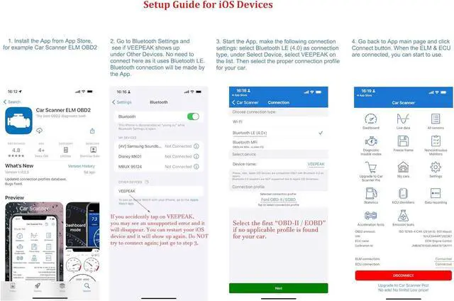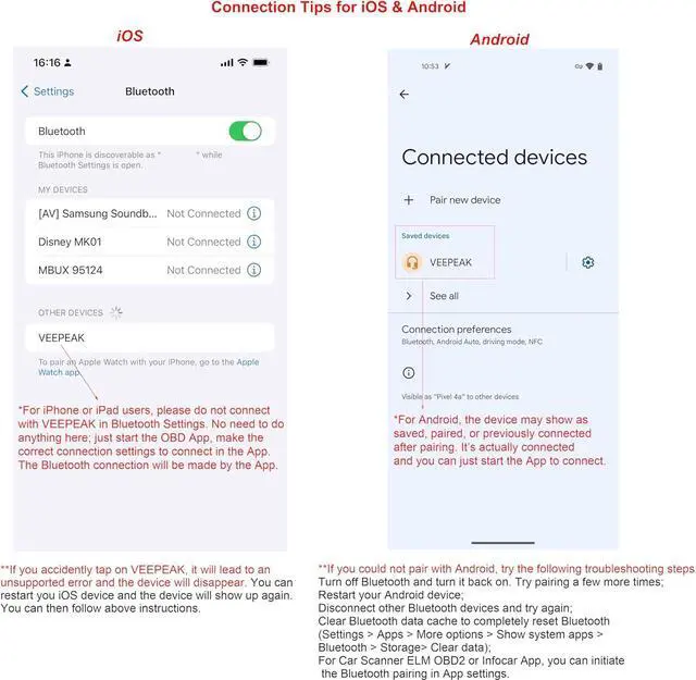 DEVICE COMPATIBILITY - Compatible with iOS via Bluetooth LE (do NOT connect with the device in iOS Bluetooth Settings; please connect directly in the OBD Apps) & Android devices via Classic Bluetooth (head units may not be compatible; for some Android phones, it may show as paired, saved or previously connected after pairing but you can just start the App to connect). For detailed iOS and Android connection & troubleshooting guide, please refer to the fifth product image or the instructions for use.