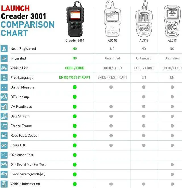 Clear Codes ]: LAUNCH Creader 3001 obd2 scanner read and clear fault codes for engine system. In addition, Creader 3001 built in fault codes definition lookup library. LAUNCH Creader 3001 obd2 scanner works on most 1996 and newer US-based vehicles that are