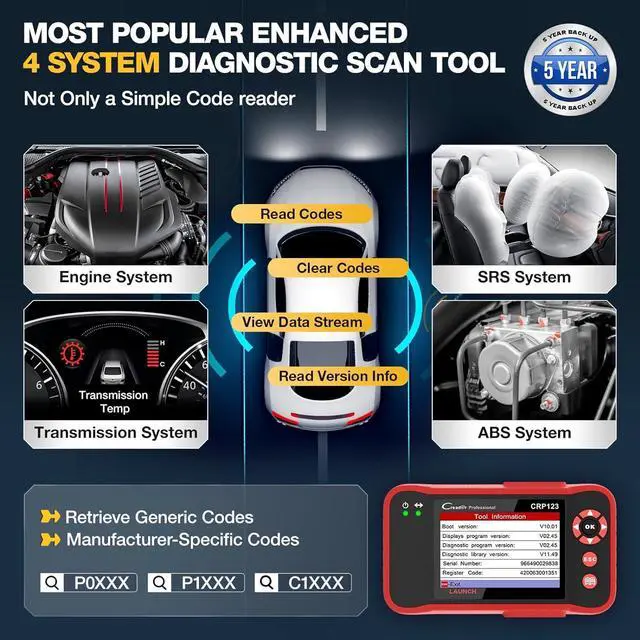 Read & Clear/Reset Engine/ABS/SRS/Transmission Diagnostic Scan Tool LAUNCH CRP123 OBD2 Scanner can test Engine, Transmission, ABS and Airbag four systems, also reads and resets code, displays data stream graphic, stores and playbacks dynamic data stream, helps to quick analysis and diagnosis.