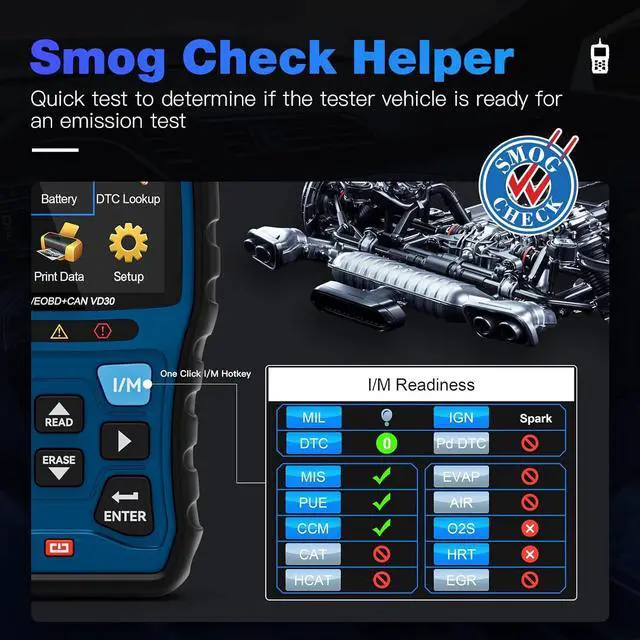ONE-CLICK SMO~G CHECK VDIAGTOOL VD30 OBD2 scanner code reader features One-Click I/M Readin~ess hot key that shows various sensor ready status on a single screen and help you keep the engin~e in good conditions, and get the vehicle ready for the annual smo~g check.