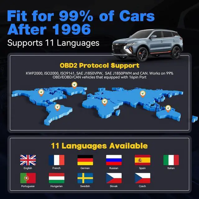 UNMATCHED VEHICLE COMPATIBILITY VDIAGTOOL VD30 universal obd2 scanner is compatible with all OBDII protocols including J1850 PWM, J1850 VPW, ISO9141-2, KWP2000, and CAN. This obd2 code reader can scan and work on most American, European and Asian auto makers sold in the US post 1996 that are OBDII compliant and uses 12 volts, including sedans, light duty trucks, SUVs, mini vans, etc.