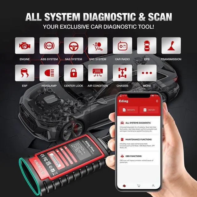 Full Systems Diagnostic ToolAs an OE-Level full systems diagnostic tool, KINGBOLEN Ediag plus supports read/clear fault codes, read live data, view 4-in-1 live data of in text & graph, ECU information, read control module information, actuation tests and maintenance functions for ECM, ABS, BCM, SRS, TCM, BMS, TPMS, SAS, A/C system etc.. The diagnosis report reveals the fault codes fast, helps you located the related components efficiently.