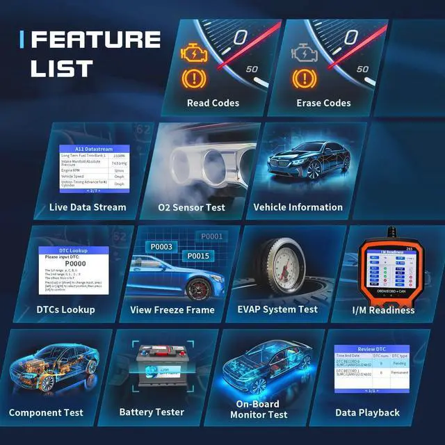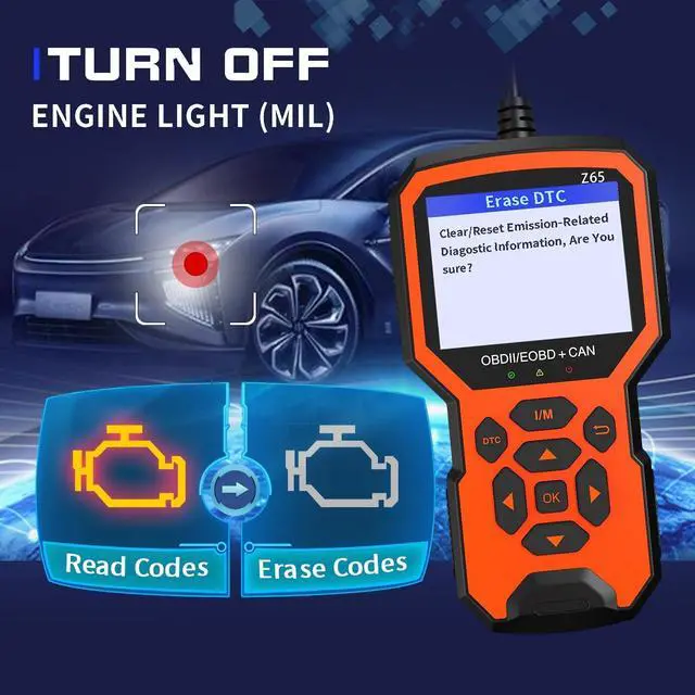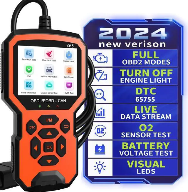 As professional car scanner, Z65 obd2 scanner diagnostic tool will help you to determine the cause of the engine light, read I/M readiness, Read & clear codes, turn off engine light or MIL, view freeze frame, retrieve vehicle VIN, battery voltage test, live data stream, O2 sensor test, onboard monitoring mode, and perform component testing etc