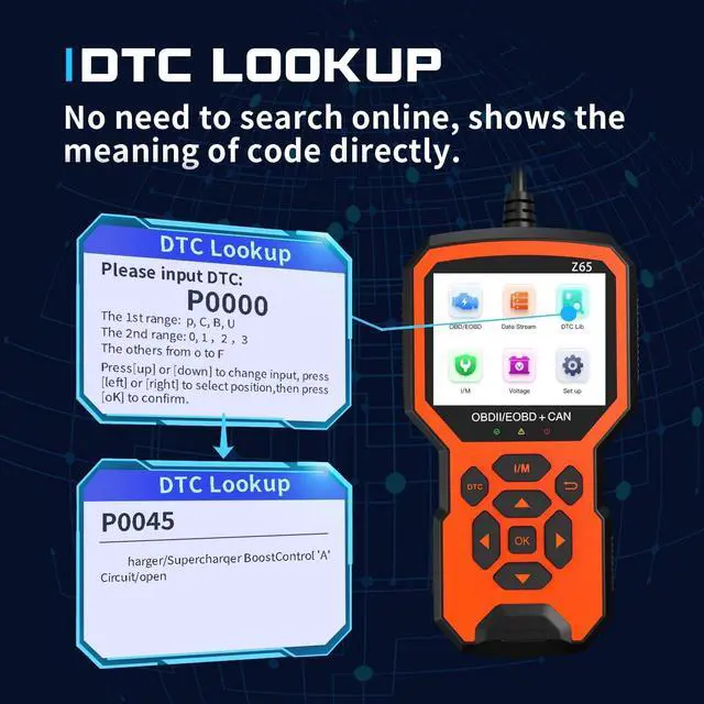 More than 65, 000 Diagnostic Trouble Codes Database- Compared with the cheap fixd obd2 scanners which usually only have 3, 000-10, 000 DTCs, the Z65 car code reader has a huge improvement which includes built-in more than 65, 000 DTCs. With the brand new operation system and enhanced hardwares, it can read more hidden codes and manufacturer controlled codes with ease.