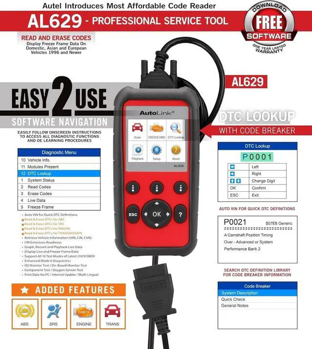 AutoLink AL629 is easy to use, this scanner can work directly once the OBDII main cable is plugged in. Easily determines the cause of the Check Engine Light/ Malfunction Indicator Light (MIL). Turns off Check Engine Light, clears codes and resets monitors.