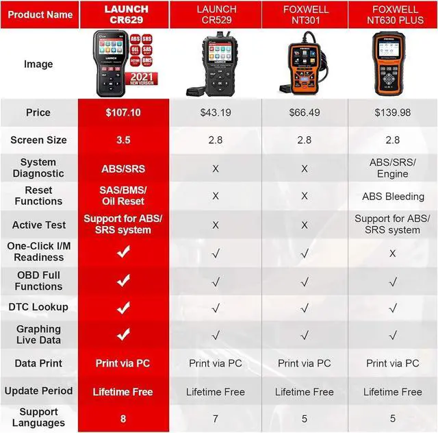Own One: Compared to other complicated scanners on the market, Launch CR629 OBD2 scanner is designed for all US family. The diagnostic scanner with a 3.5 inch large LCD color display and built in speaker for providing a better visual and auditory effects. Besides, it supports Codes analysis and Printer compatible, Live data graphing and logging, and Lifetime free update.