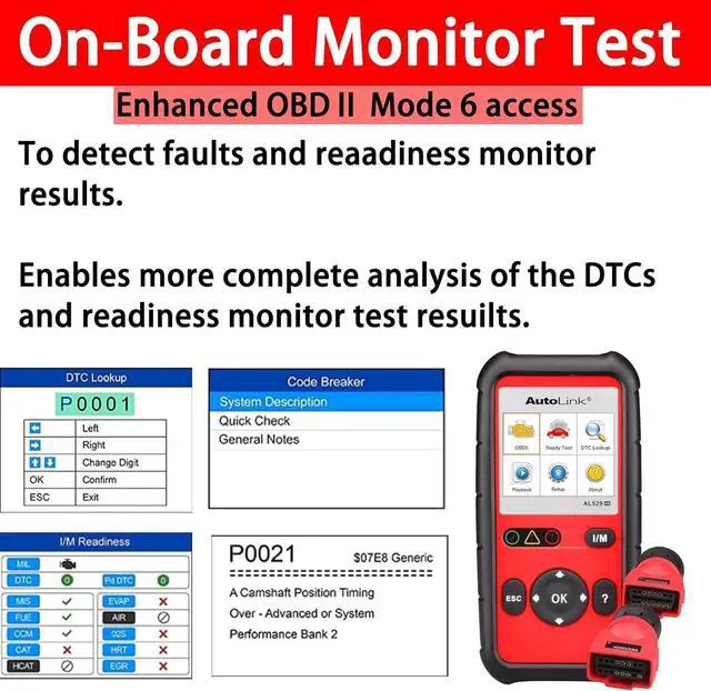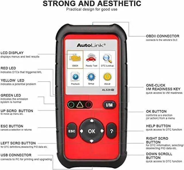 AL529HD troubleshooting program code prompts to help technicians in effective vehicle diagnosis and maintenance, patented one-key ready button, used for quick status check and driving cycle verification, color-coded leds and built-in speakers provide visual and audible tones to Verify that it is ready.