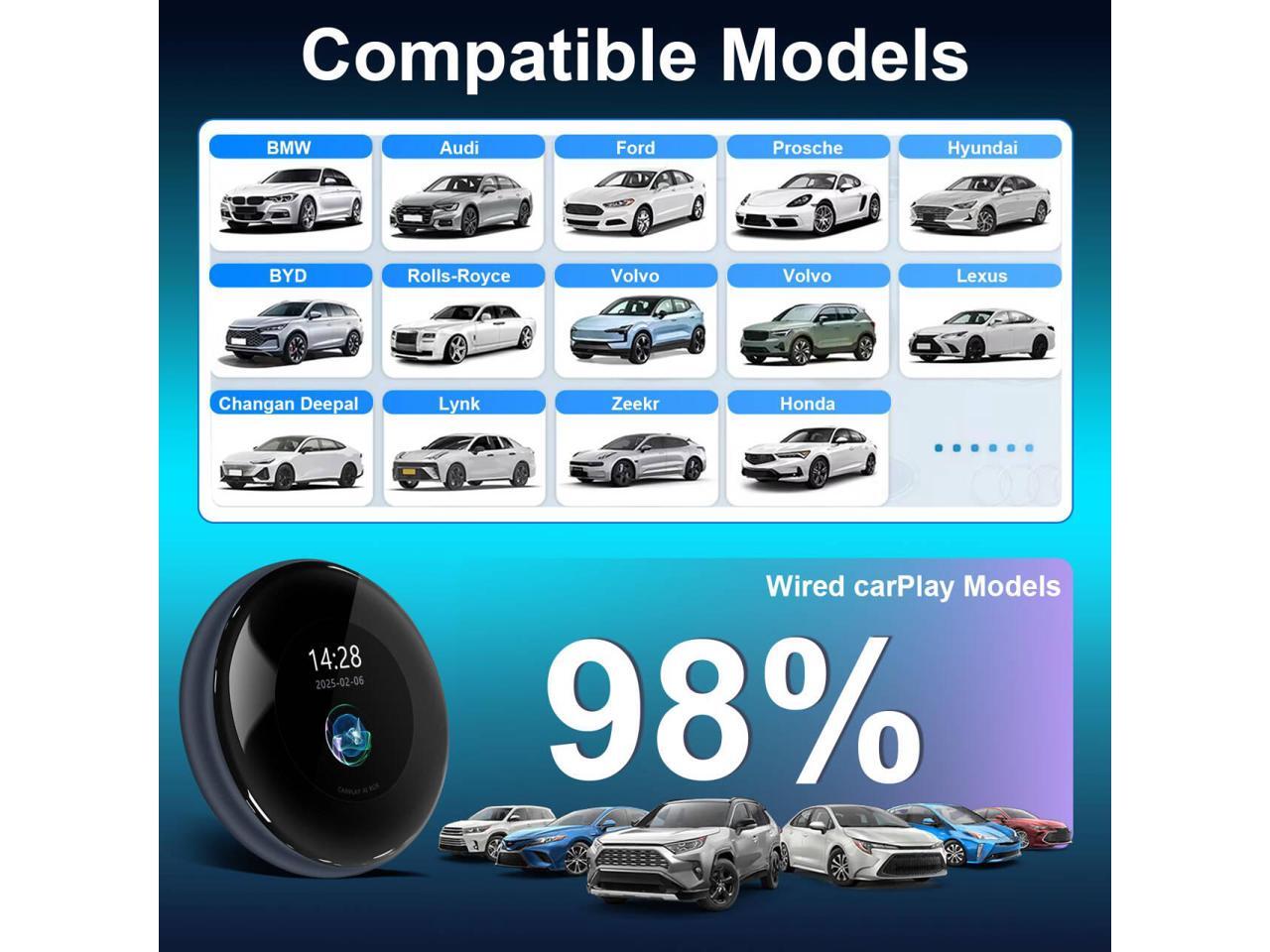 "Wireless CarPlay and Android Auto:Effortlessly upgrade wired CarPlay to wireless CarPlay and wireless Android Auto. This plug and play wireless adapter is compatible with 98% of vehicle models, including BMW, Audi, Ford, Porsche, Hyundai, BYD, Rolls-Royce, Volvo, Lexus, Changan Deepal, Lynk, Zeekr, Honda, and moresay goodbye to cable clutter for good