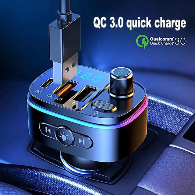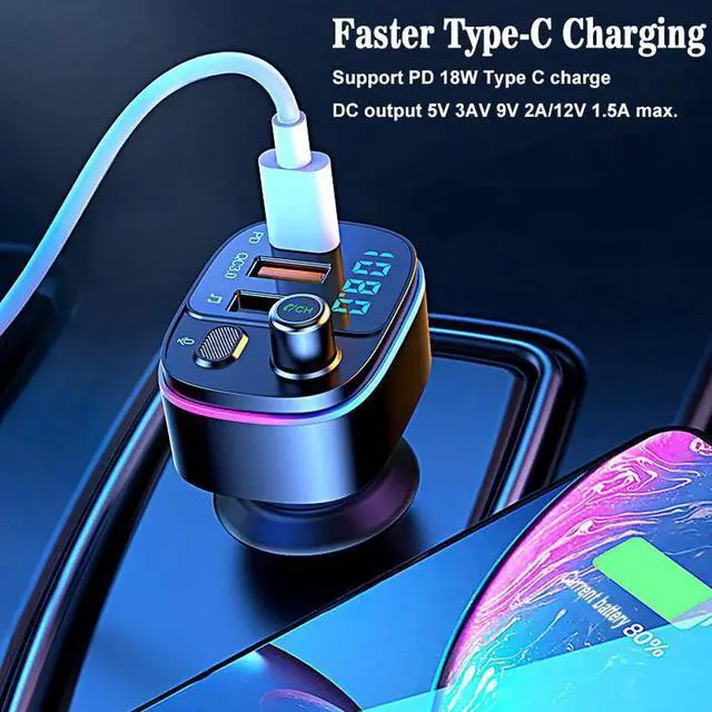 Bluetooth 5.0 FM Transmitter for Car, QC3.0+Type-C PD 20W Car Charger, Wireless FM Radio Bass Sound Music Player, Car Kit with Hands-Free Calls, Support U Disk,7 Colors LED Backlit
