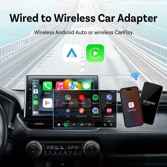 The 2-in-1 Wireless CarPlay & Android Auto Adapter converts your factory wired CarPlay to wireless. With dual-band 2.4/5GHz WiFi, OTA upgrades, Bluetooth connectivity, andand U plug-and-play design, this adapter delivers a seamless wireless experience for both iPhone and Android users.