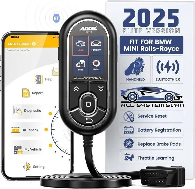 2025 3 IN 1 BLUETOOTH OBDII SCANNER: The ANCEL BD330 OBD2 scanner diagnostic tool is the only 3-in-1 troubleshooter for the BMW series, offering Bluetooth modes, wired modes and heads-up design for easy setup and use. Auto-scan all electrical control units. 4 hot service functions specifically designed for the BMW series, including Service Reset, EPB Reset, ETC Reset, and Battery registration
