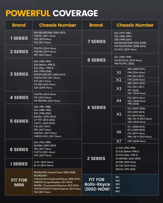 EXTENSIVE LIST OF COMPATIBLE VEHICLES: The ANCEL BD330 car code reader is specifically designed to be compatible with BMW, MINI, and Rolls Royce vehicles. It works seamlessly with a wide range of BMW models, including 1/2/3/4/5/6/7/8/X/Z series, as well as MINI models such as R50/R52/R53/R55/R56/R57/R58/R59/R60/R61/F54/F55/F56/F57/F60 series. For Rolls Royce, it is compatible with RR1/RR2/RR3/RR4/RR5/RR6/RR7 series manufactured after