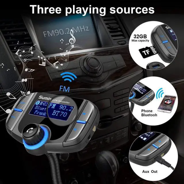 • Special Design: large key for easy operation; 1.7 Inch large LCD backlight display song name/ incoming phone number and shows your car's battery level when car start; Can rotate the LCD display screen in 270 degree gooseneck for optimal viewing comfort; Turn off the FM transmitter: long pressing the next song key for 5 seconds, it will turn off the FM and functions keep charging function