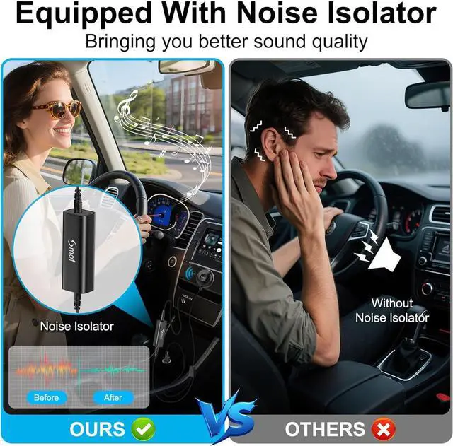 Noise isolatorNormally, the sound quality is very good. If you encounter background noise, just plug the product' s audio cable into one port of the isolator, and then connect the other port of the isolator to your car AUX input To get high-definition sound.