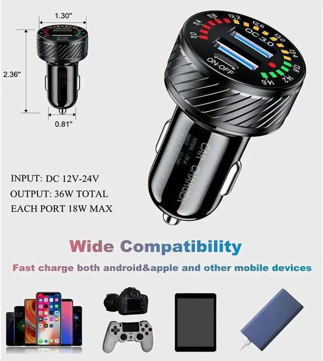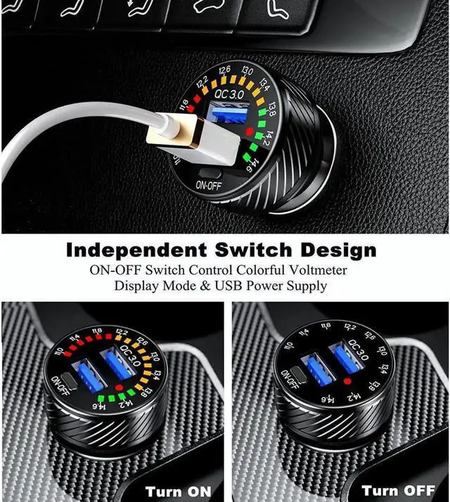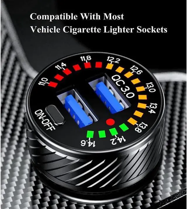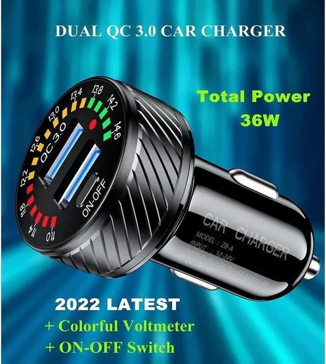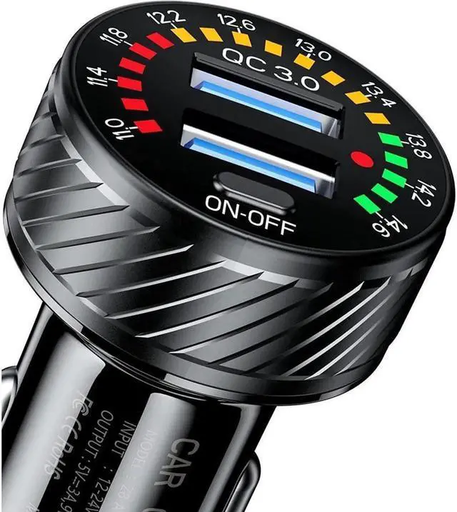 This fast car charger with colorful voltmeter & ON/OFF switch. When dual QC 3.0 port not connected to mobile devices, the colorful voltmeter will always display the voltage value of the car battery in real time.