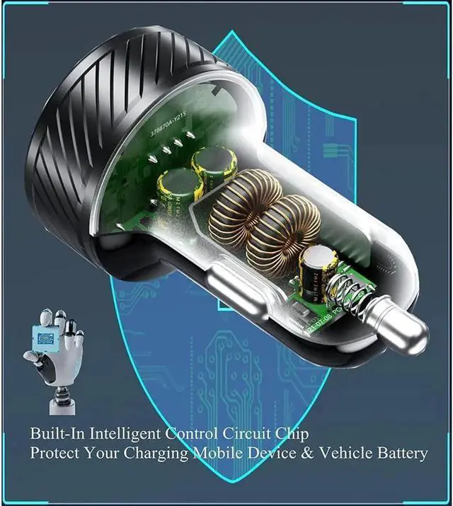 This dual QC 3.0 car charger built-in intelligent control chip and fuse: provide overcurrent protection, overvoltage protection, overtemperature protection, overcharge protection, short circuit protection, reverse wiring protection. Ensure the safety of your charging device and vehicle battery.
