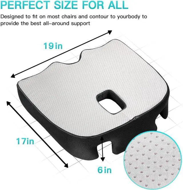 Relieves Pain and Improves PostureThe ergonomic " W" shape of our cushion provides support and comfort while reducing pressure on your lower back, waist, and hips. It also helps improve your posture, reducing the risk of pain and discomfort.