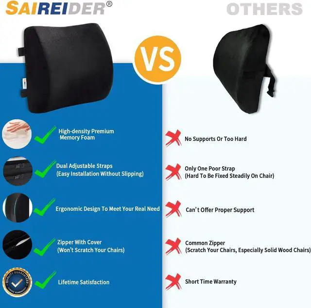 • Premium MaterialsOur back support pillow adopts 100% high density, durable and precisely molded memory foam which insures a firm comfy fit and enhance your comfort while retaining its density. Youll enjoy customized support and comfort that you just cant get from common hard foam lumbar cushions.