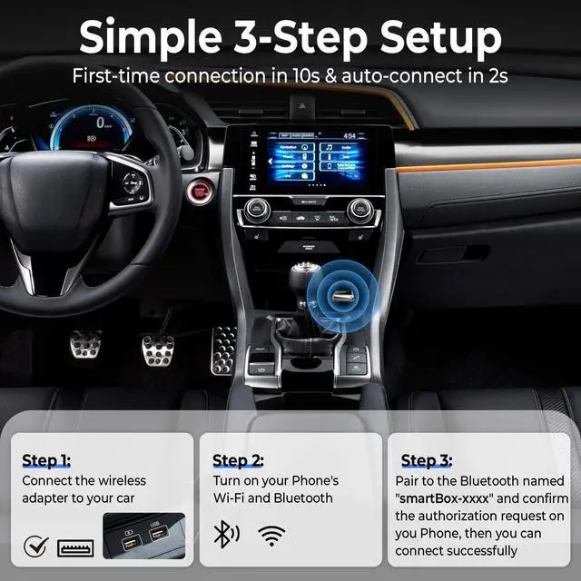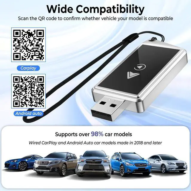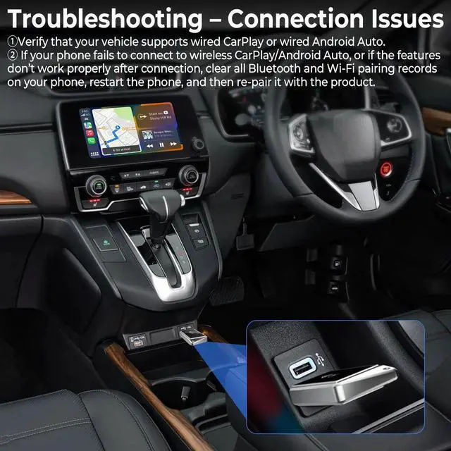 2-in-1 Wireless CarPlay & Android Auto easily converts your cars wired system into wireless with this wireless carplay adapter and android auto wireless adapter. Enjoy navigation, music streaming, voice commands, and calls without messy cables. (Note: CarPlay requires an iPhone, while Android Auto requires an Android phone. If the car supports both, either phone type can be used.) Troubleshooting-Connection Issues: Verify that your vehicle supports wired CarPlay or wired Android Auto. If your phone fails to connect to wireless CarPlay/Android Auto, or if the features dont work properly after connection, clear all Bluetooth and Wi-Fi pairing records on your phone, restart the phone, and then re-pair it with the product.