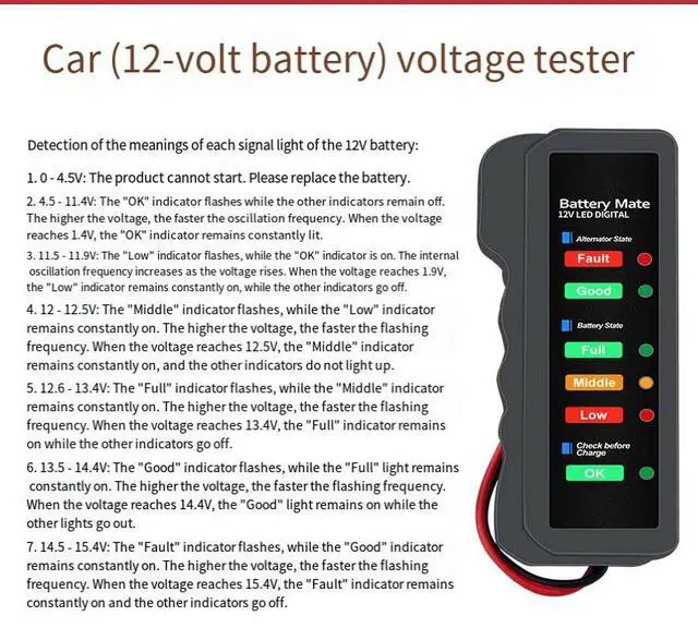 The BM310 can quickly detect the condition of the car battery and its charging level, and corresponding LEDs will display theinformation. It is suitable for 12V batteries of electric vehicles, motorcycles, golf carts, and household cars (except for busesand trucks which have 24V batteries). The operation is simple, the use is convenient and it is safe. It is equipped with a safetychip inside to ensure stable operation, high temperature resistance and low temperature resistance.