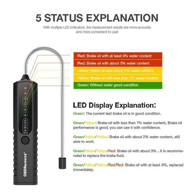 This tester uses a high-precision sensor to measure water content in brake fluid. Results are displayed instantly on a bright 3-color LED screen: