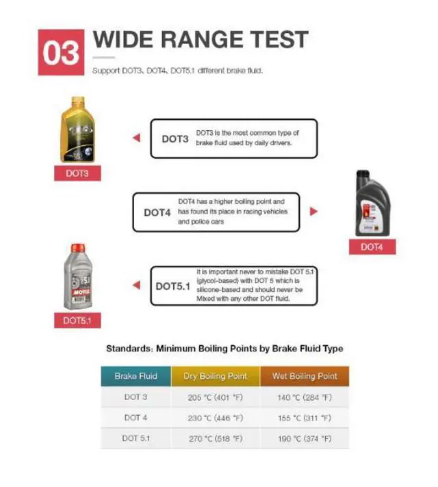 Supports DOT3, DOT4, and DOT5.1 brake fluids. Whether you drive a family sedan, SUV, or motorcycle, this tool is ready to help.