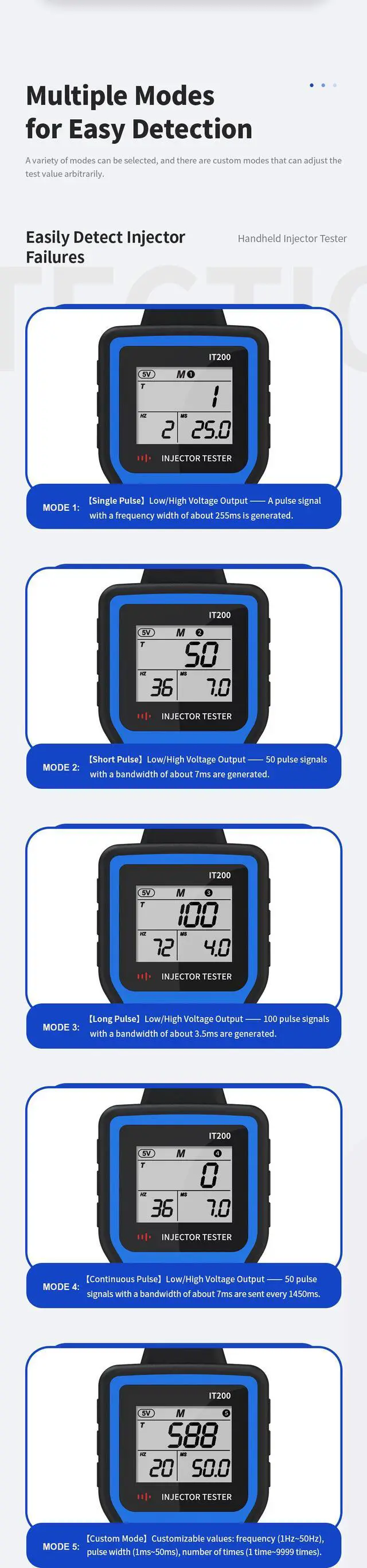 Supports 5 working modes (Modes 1 to 4 are preset modes, while Mode 5 is a custom mode [custom pulse width, frequency, and test times]).