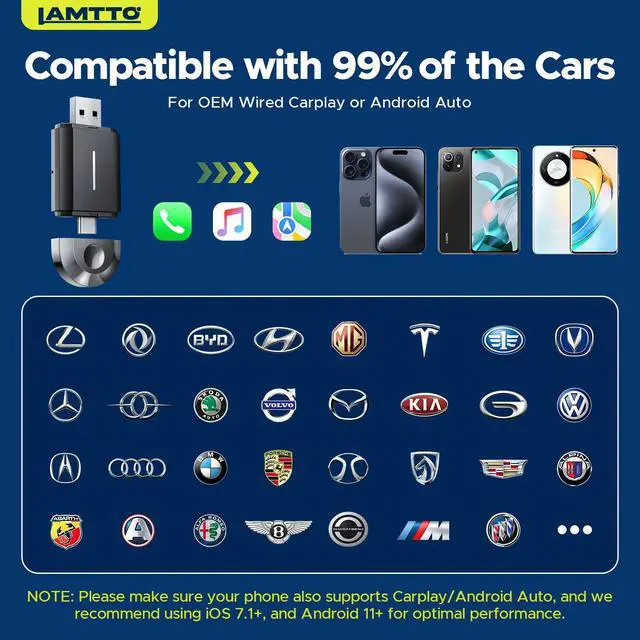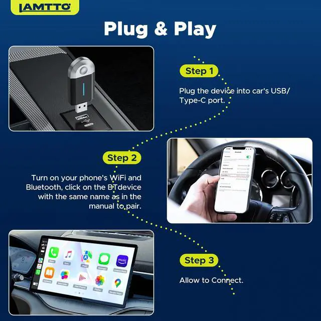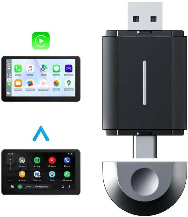 The SOEWIOU 2-in-1 Wireless CarPlay Adapter & Android Auto Wireless Adapter Box is designed to upgrade your in-car connectivity experience. This compact dongle converts your vehicles wired CarPlay system into a fully wireless interface, supporting both Apple CarPlay and Android Auto for maximum versatility. With broad compatibility for 98% of vehicles equipped with wired CarPlay (model years 20152024), it ensures seamless integration with your existing setup. Featuring a reliable 5GHz WiFi connection and support for both Type-C and USB interfaces, the adapter enables effortless navigation, hands-free calling, and music streaming. Simply plug the device into your vehicles CarPlay port, connect via Bluetooth, and enjoy enhanced convenience and safety on every journey. Lightweight and portable, the adapter measures 6.10 × 4.13 × 0.51 inches and weighs just 0.0522 lbs, making it easy to carry and install. Power input is supported from 7V to 32V, ensuring compatibility with a wide range of vehicles.