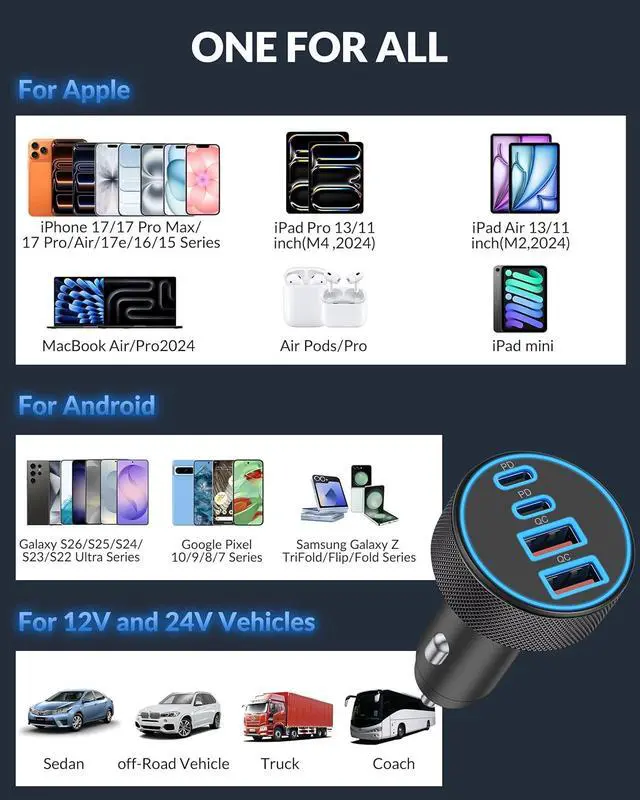 Widely Compatibility: 90W 4-Port Car charger accessories fits for all USB-C & USB-A devices, compatible with iPhone 17/17e/Air/16e/16/15/14/13/12/11/Pro Max/XS/XR/X/SE, iPad Pro/Air/Mini, Samsung Galaxy S26 Ultra/S26+/S26/S25/S24/S23/S22/S21/S20/Ultra, Google Pixel 10/9/8/7/6/5/4 XL, Moto, LG, Android, Tablets, Laptop, Power Banks, Camera, Driving Recorder, GPS Navigation, and more