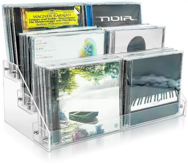 Exquisite CD Holders: Tabletop step-tiered CD jewel case organizer made of thickened acrylic material, which is more sturdy and can resist scratches and cracks. The acrylic material is lighter and less burdensome to move. Perfect for record album storage racks.
