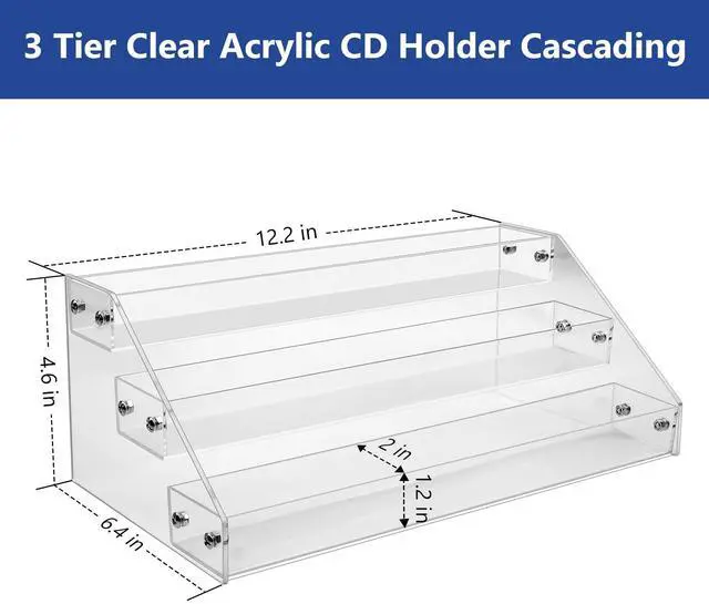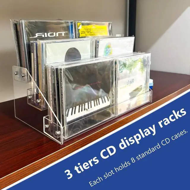 3Layer Clear Acrylic CD Organizers: 3 tiers CD display racks. Shelf Slot width is 1.9 inches, suitable for Report jewel CD cases. With Report length, each slot can contain Report standard CD cases. It fits perfectly on any desk or shelf and looks nice while keeping your CDs organized.