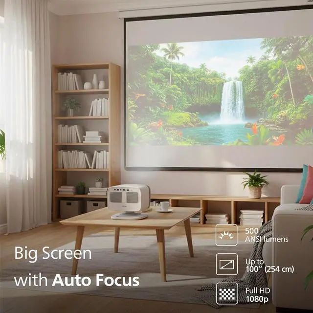 Dimensions: 195 x 219 x 194 mm Weight: 2.48 kg In the box: Video projector, power cable, remote control, and battery. USB-C to HDMI cable. Getting started guide.