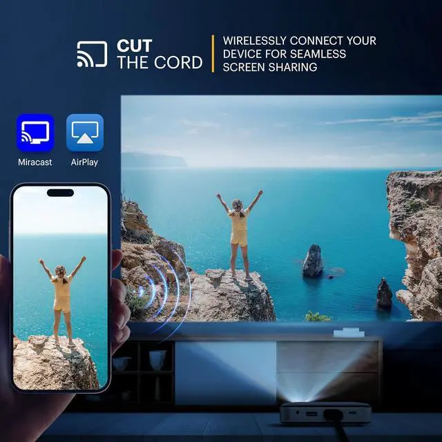 WIRELESS SCREEN MIRRORING WITH AIRPLAY & MIRACAST - Skip the cables and stream effortlessly using Airplay or Miracast. Instantly project your iPhone, Android, tablet, or laptop wirelesslyperfect for cookie decorating, movie nights, and spontaneous sharing from any room, dorm, or hotel.