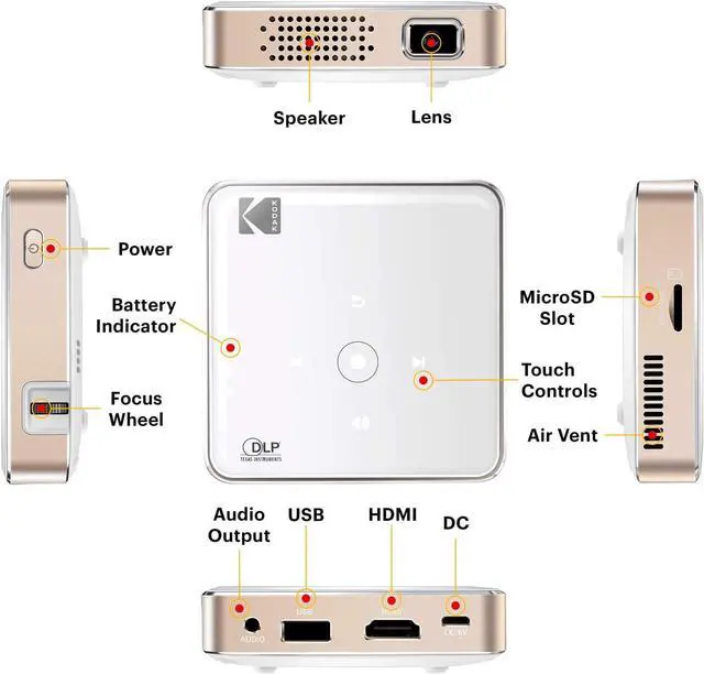 Enjoy stunning HD video and imaging in the palm of your hand with the Small DLP Pocket Projector from KODAK. Integrating revolutionary innovations in compact digital design, this miniature movie player produces high quality imaging in a truly portable package. Transport to the fantasy world of your choice with a booming 1.5W speaker and dazzling 16.7 million color display. Compatible with todays most popular entertainment devices, the projector includes a 3.5mm input and integrated HDMI, USB and MicroSD hookups. Simply connect your PC, Mac, cable box, gaming console or HDMI video player without the hassle of complicated buttons and menu screens. Just plug, play and experience a pocketful of possibilities!