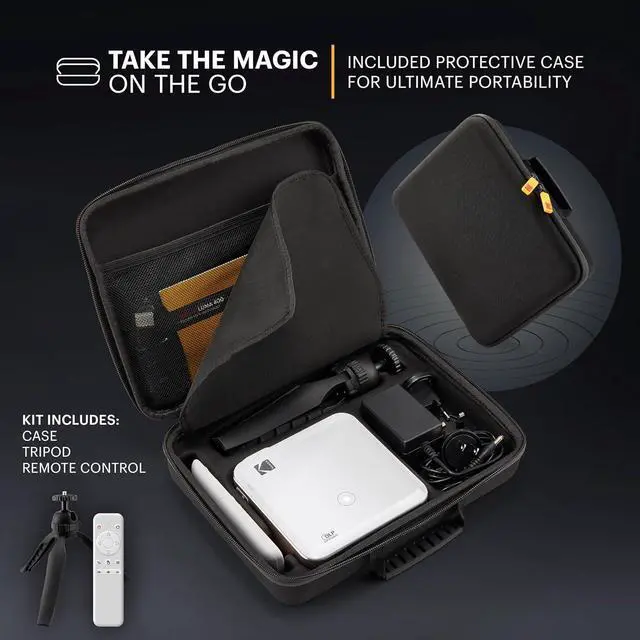 TRAVEL-READY KIT Weighs under 1 lb (430 g) with a 2.5-hr battery. Slip projector, remote, charger & cables into the padded Kodak case and take cinema anywherepower-bank friendly via USB-C PD.