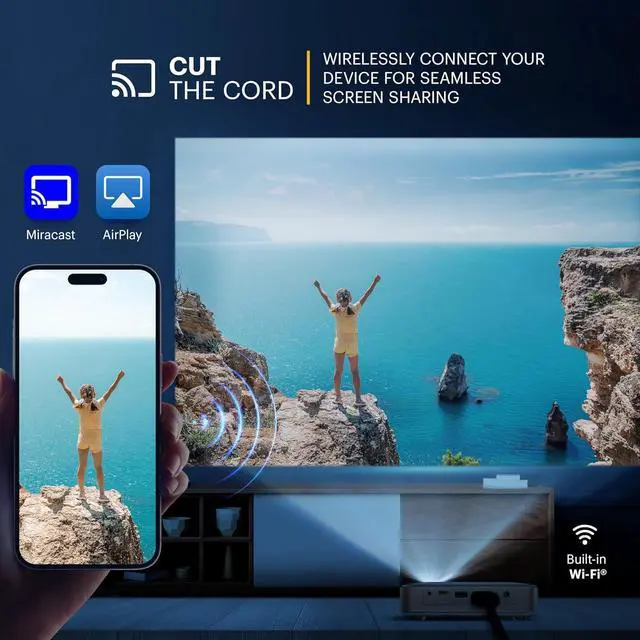 BIG, BRIGHT PICTURE ANYWHERE 150 ANSI lumens, 1280 × 720 p native, 16.7 M colors, and 10-150 in image size bring movies, games & slideshows to lifeindoors or out.