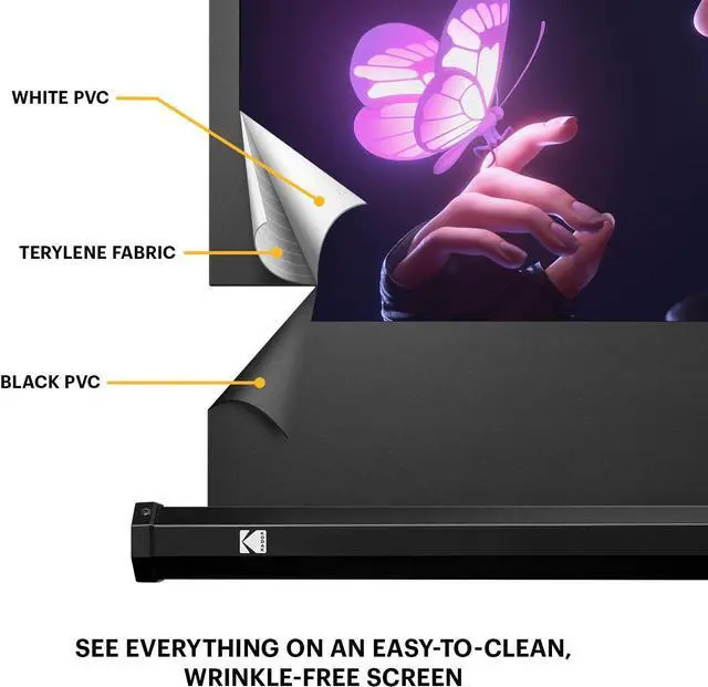 EXPANSIVE 100 PROJECTION SCREEN | Premium Matte White Surface is Made of Lightweight Yet Durable PVC & Terylene Fabrics to Control Ambient Lighting, Prevent Wrinkles, Minimize Pixelation & Deliver a Clear, Full-Color 16:9 Experience | 1.0 Gain Reflection & 160° View Angle Ensure Ideal Brightness & Image Fidelity