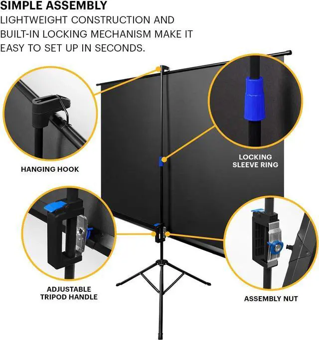 STURDY ADJUSTABLE TRIPOD STAND | Rugged Black Metal Alloy Tripod Easily Sets Up, Folds Down & Stores Discreetly with Rolled-Up Screen for Convenient Use in Any Setting | Simple Locking Frame, Nonslip Feet & Height Adjustment Enable Fast Setup, While Super Strong Poles Reduce Shake & Keep Display Securely in Place