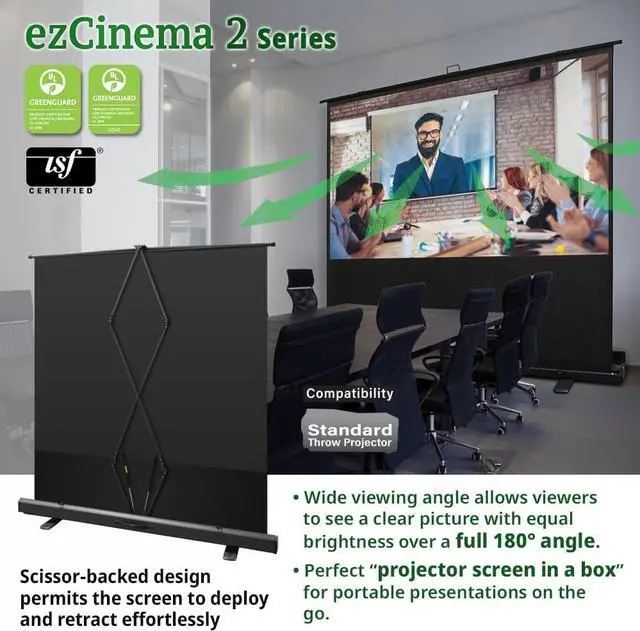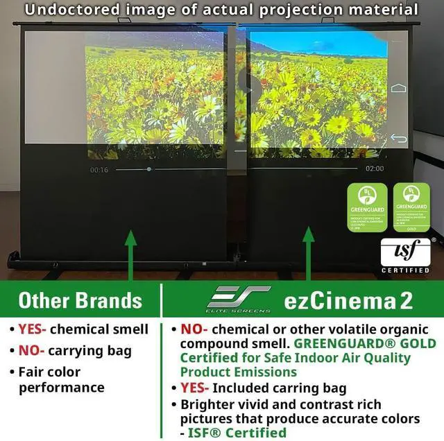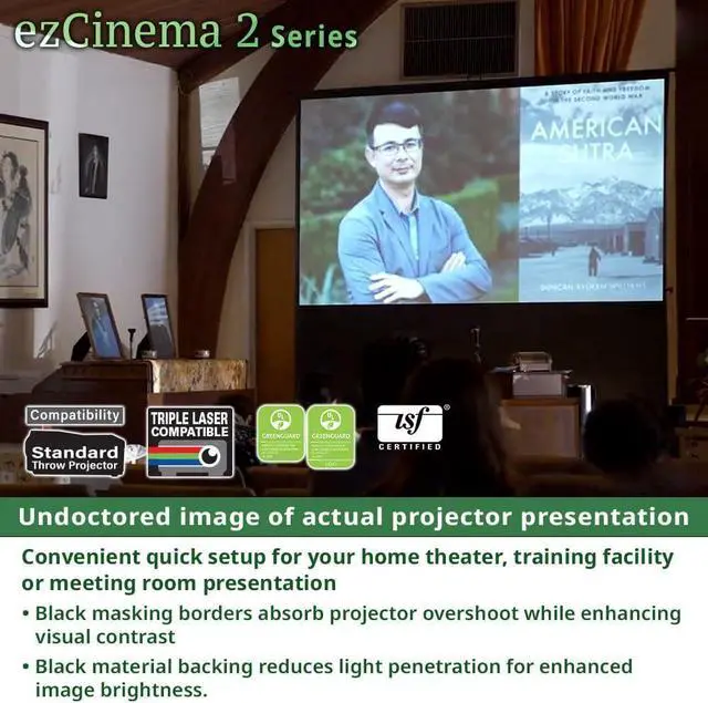 [Ceritification] : ISF (Imaging Science Foundation) Certified GREENGUARD and GREENGUARD Gold Certified UL 2818 Safety Indoor Air Quality Product Emissions. Recommended for standard throw (long throw) projectors. ***NOT COMPATIBLE WITH ULTRA SHORT THROW PROJECTORS ***