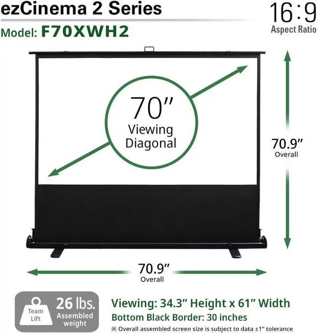 [Projection Screen Size]: 70-INCH Diagonal View, 16:9 Aspect Ratio. View Size: 34.3" H x 61.0" W. Overall Size: 70.9" H x 70.9" W. BLACK CASE. (Model Number: F70XWH2)
