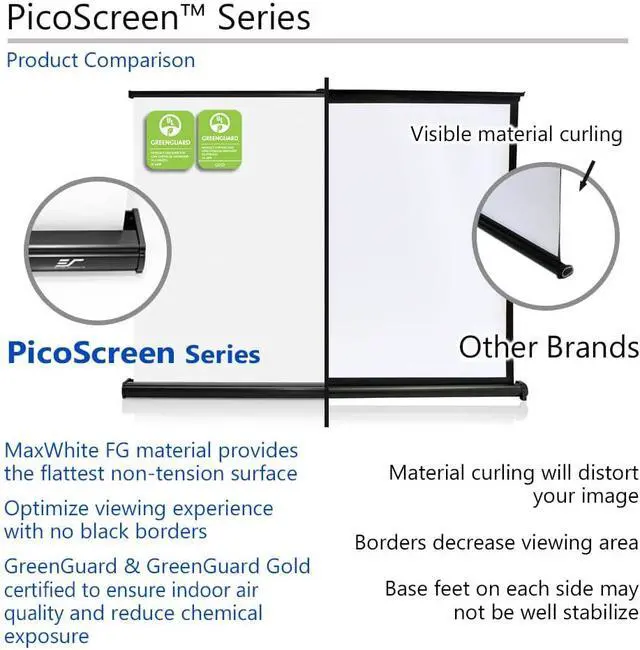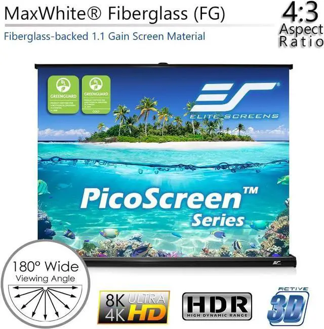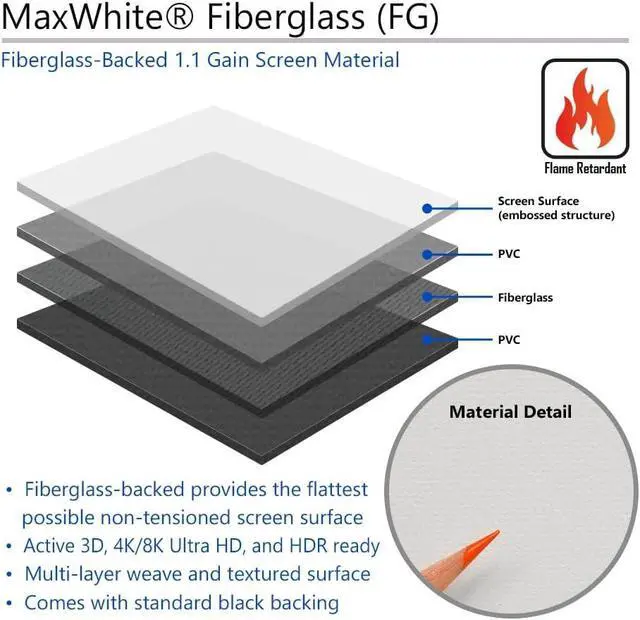 Screen Material: MaxWhite, 1.1 Gain. Multi-layer weave, 180 degree wide viewing angle, fully black backed front projection screen with textured surface. 4K Ultra HD and Active 3D Projection Ready. GreenGuard and GreenGuard GOLD Certified | UL 2818. Easy to clean with soap and water.