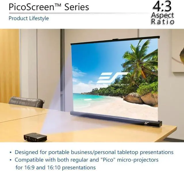 Table-top projection screen features an incredibly easy set-up that utilizes a "scissor-back" spring mechanism for complete set-up in seconds. Accomodates both regular, pico and micro projectors.