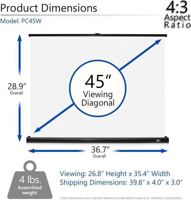 [DIMENSION AND SIZE]: 45-inch Diagonal, 4:3 Aspect Ratio. View Size: 27.0" H x 36.0" W. Overall Size: 28.9" H x 36.7" W x 2.6" D. Black Case.