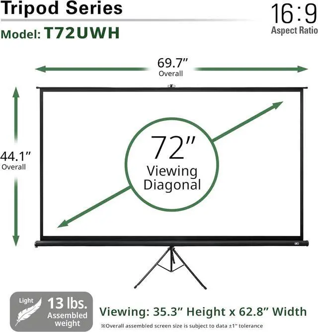 Projector Screen Size: 72-inch Diagonal, 16: 9 Aspect Ratio. View Size: 35. 4" H x 62. 6" W. Overall Size: 95. 9" H x 69. 4" W x 43. 3" D. Black Case. (Model: T72UWH)