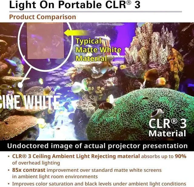 Ceiling Light Rejecting Technology for Bright Rooms The Light-ON CLR 3 Series is engineered to absorb up to 90% of overhead lighting, eliminating the washout effect caused by ceiling lights. Delivers vibrant, contrast-rich images in classrooms, living rooms, and other bright environments.
