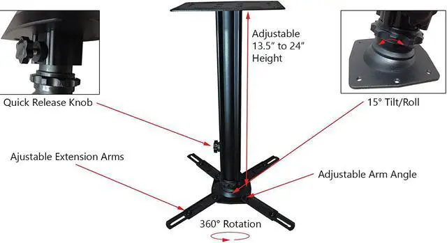 Height adjusts from 13.375" to 23.625" by the included extension;15 degree tilt, 360 degree rotation lets you align your projector like a professional.